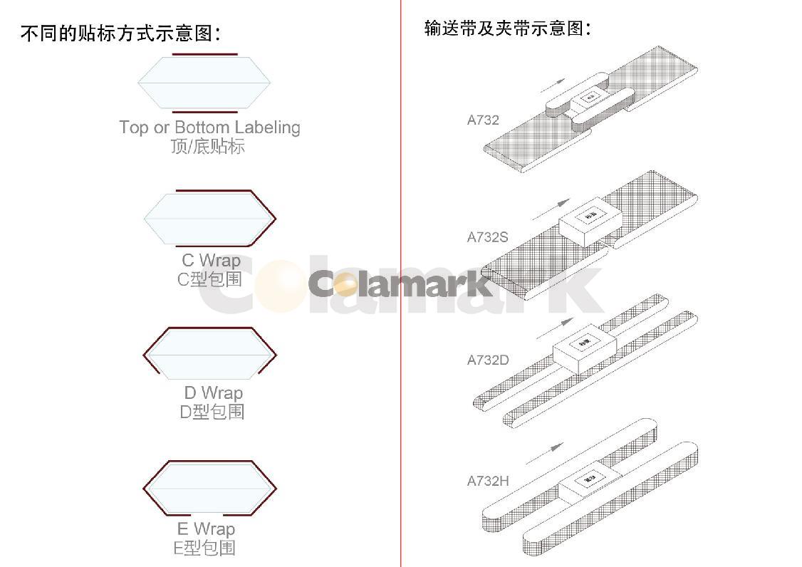 A732系列有多種配置變化適應(yīng)不同的應(yīng)用要求,通用型號(hào)A732提供上下貼標(biāo)兩組送標(biāo)器,獨(dú)立進(jìn)出輸送帶,及中間夾帶輸送以實(shí)現(xiàn)上下兩個(gè)平面同時(shí)貼標(biāo),夾帶輸送方式保證了貼標(biāo)穩(wěn)定,不受物品重量及厚薄影響,避免貼標(biāo)位置盲區(qū),并允許C及D型的包圍貼標(biāo)。A732同時(shí)提供多種變化的物料輸送方式來實(shí)現(xiàn)頂/底面同時(shí)貼標(biāo)的要求,包括兩段輸送帶、雙平行輸送帶、延長夾帶等等。 平面貼標(biāo)機(jī)