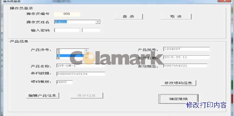 打印內(nèi)容在登錄界面修改??梢赃x擇已保存的產(chǎn)品序號(hào),或者點(diǎn)擊“修改噴碼信息”按鈕,直接編輯打印內(nèi)容。另外有兩種打印模板,一種大字體,一種小字體,根據(jù)實(shí)際需要選擇。如下圖打印位置調(diào)節(jié)