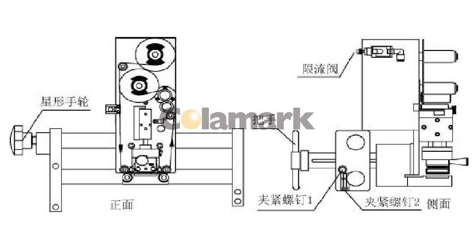 打印頭與色帶之間,需要一定的距離,避免打印動(dòng)作前,打印頭直接接觸色帶, 造成色帶提前老化,影響打印清晰度。 打印頭安裝字粒后,需要保證字粒與色帶的間隔為1~2mm。調(diào)整時(shí),松開氣缸的 固定螺釘,通過滑動(dòng)氣缸在安裝座上的前后位置,調(diào)節(jié)氣缸與打印位置之間的距 離。調(diào)整時(shí),觀察字粒與色帶之間的間隔,合適后鎖緊固定螺釘。